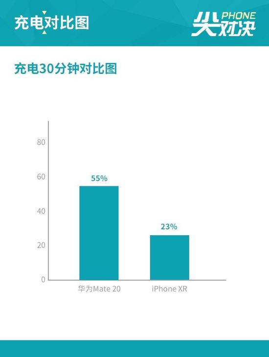 在30分钟的充电测试上,华为Mate 20具有绝对的优势,即使是4000mAh大电池,在半个小时的时间内也充进55%的电量,而iPhone XR的5W充电功率拖了后腿,半个小时只充进23%的电量。